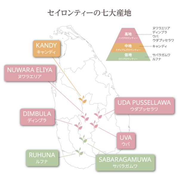 スリランカには「七大産地」(※)と呼ばれる茶葉の産地があり、茶葉はその地域の標高やモンスーンの影響によって味わいが異なり、年間を通して多様な紅茶が産出されます。