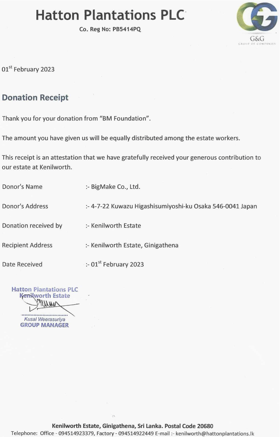 BM Foundationでは、これまでの経験と茶園農家の現況を踏まえて、茶園で働く多くの人々の生活の質を少しでも改善していくことを目的に、これからも多くの茶園に対して支援寄金行っていきます。