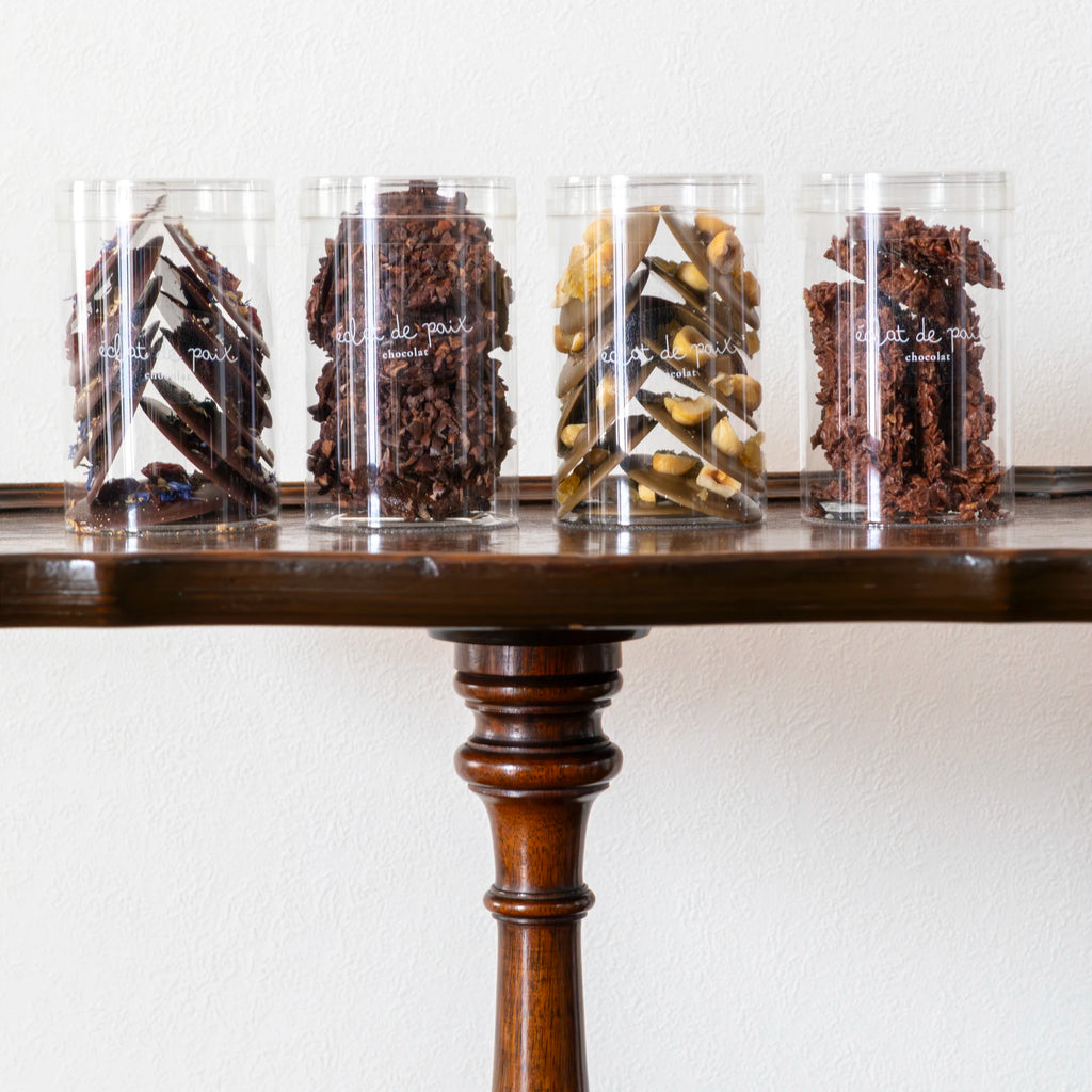 - 原材料:チョコレート(カカオマス、粗糖、ココアバター)(国内製造)、米粉クランチ(米粉、米油、水飴、加工でん粉)、ワッフルクランチ(小麦粉、砂糖、植物油、卵、食塩)アーモンド、カシューナッツ/トレハロース、乳化剤(大豆由来)、香料、カラメル色素、(一部に小麦・乳・卵・大豆・アーモンド・カシューナッツを含む)
